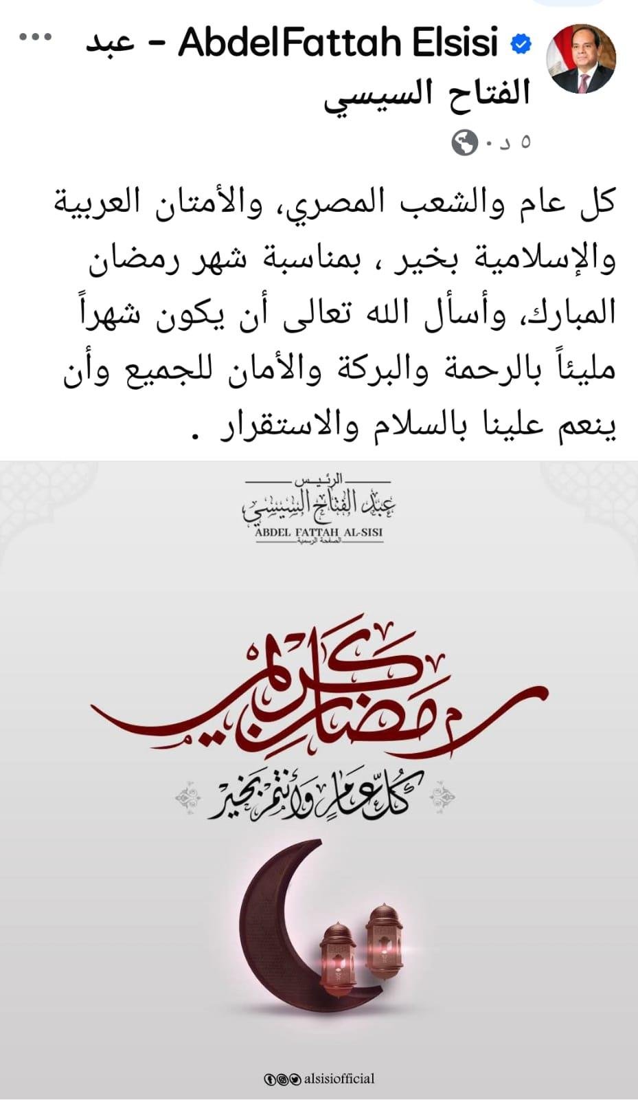 وجاءت تهنئة الرئيس عبر صفحته الرسمية على مواقع التواصل الاجتماعي، حيث قال: «كل عام والشعب المصري، والأمتان العربية والإسلامية بخير بمناسبة شهر رمضان المبارك، وأسأل الله تعالى أن يكون شهرًا مليئًا بالرحمة والبركة والأمان للجميع، وأن ينعم علينا بالسلام والاستقرار».