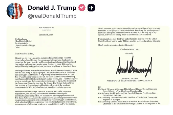 واختتم ترامب رسالته بالتأكيد على أن التوصل إلى اتفاق دائم بين دول حوض النيل ممكن، شريطة توافر الإرادة السياسية، والاستعانة بالخبرات الفنية المناسبة، وإجراء مفاوضات عادلة وشفافة، مع دور أمريكي فاعل في المراقبة والتنسيق بين الأطراف.