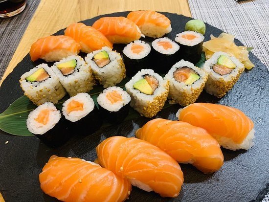 شرائح السمك النيء الطازج (سلمون، تونة) أو بدائل مطهوة مثل الجمبري والدجاج.