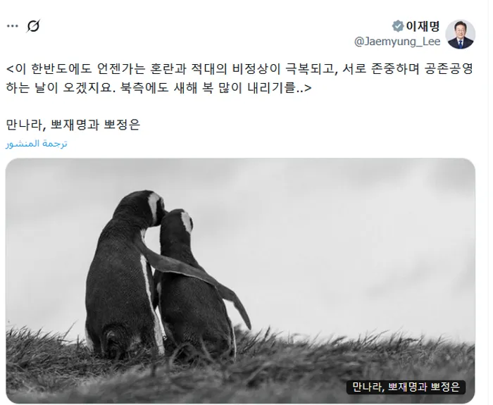 في خطوة لافتة تحمل طابعًا رمزيًا، نشر الرئيس الكوري الجنوبي لي جاي ميونج صورة لبطريقين يتعانقان، ضمن رسالة تهنئة بالعام الجديد وجهها إلى كوريا الشمالية، داعيًا من خلالها الزعيم الكوري الشمالي كيم جونج أون إلى لقاء مباشر، وفق ما أفادت به وكالة «فرانس برس».