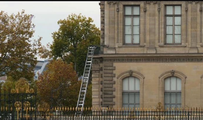 واستغلّ اللصوص هذه الأعمال للدخول من منطقة غير مؤمنة بشكل كافٍ، مستخدمين رافعة صغيرة موضوعة على شاحنة للوصول إلى إحدى النوافذ الجانبية المؤدية إلى قاعة العرض.