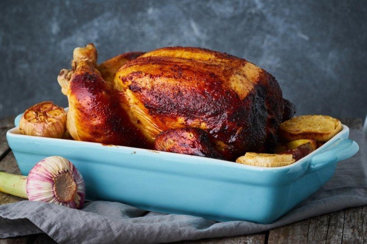 الطهي: تُوضع الدجاجة في صينية فرن، يُضاف إليها ماء أو مرق دجاج حتى تغطي القاع، ويُدهن الدجاجة بصلصة الطماطم أو معجون الطماطم المخفف.