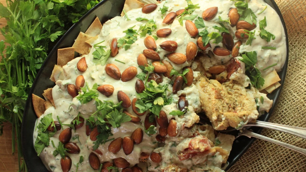 في طبق التقديم، يُفرش الخبز المحمّص في القاع، ويُسكب فوقه خليط الزبادي بالتساوي، ثم تُضاف طبقة من المكسرات المحمّصة أو الصنوبر على الوجه لإضفاء لمسة مقرمشة مميزة.