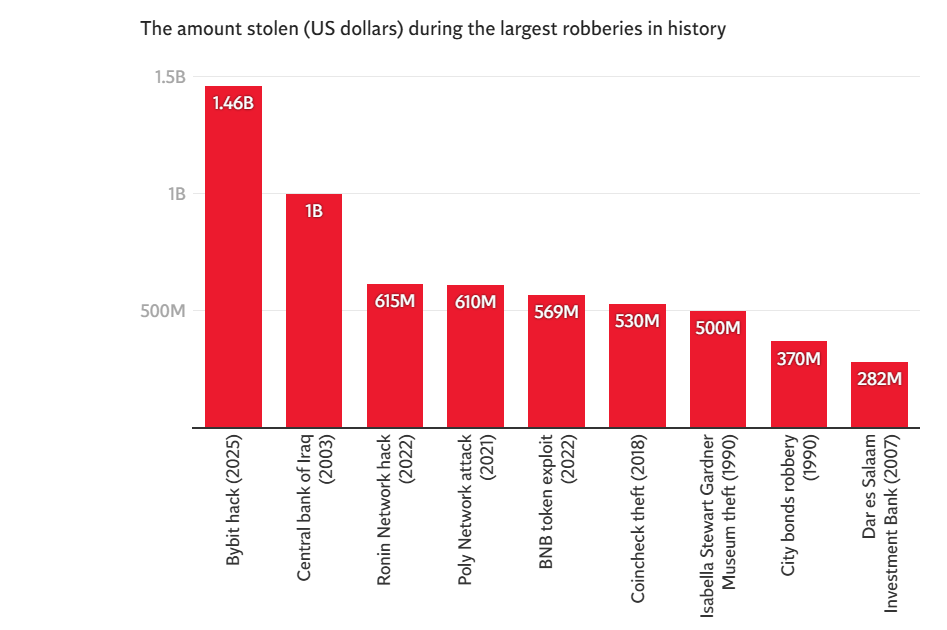 ففي غضون بضع دقائق فقط، تمت سرقة ما يقرب من 1.46 مليار دولار من العملة الرقمية من  Bybit، إحدى أكثر بورصات العملات المشفرة شهرة في العالم، وتم توجيهها عبر الإنترنت إلى محافظ مجهولة.
