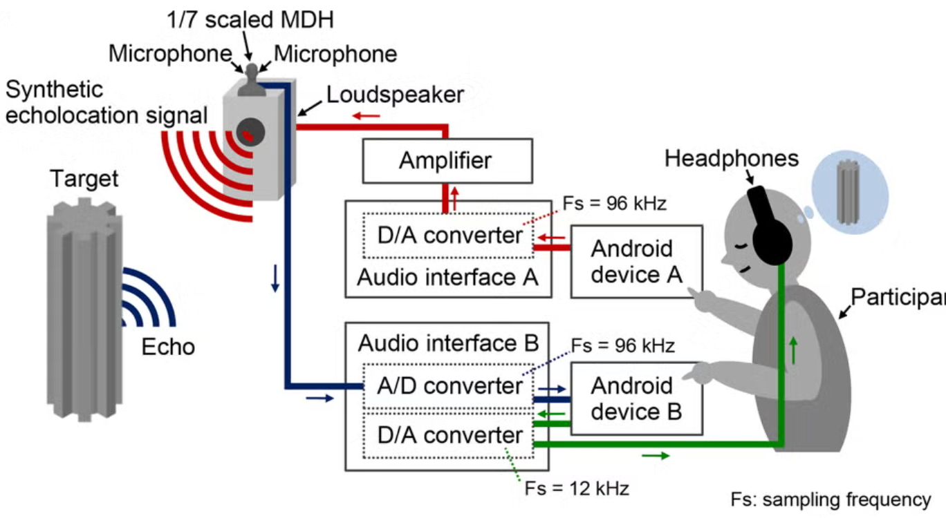 لاختبار قدرة المشاركين على استشعار تحديد الموقع بالصدى، زوّد فريق سوميا المشاركين بسماعات رأس وجهازين لوحيين – أحدهما لتوليد إشارة تحديد الموقع بالصدى الاصطناعية، والآخر للاستماع إلى الأصداء المسجلة.