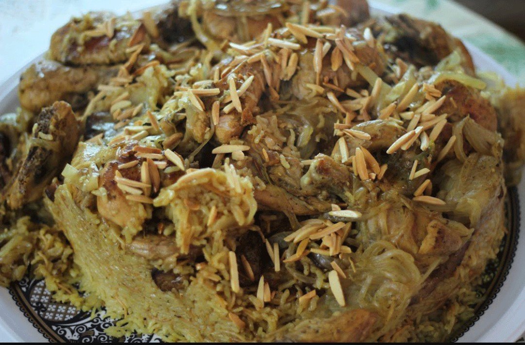 بالنسبة للحم، يتم تتبيله بالبهارات المخصصة ويُطهى على نار هادئة مع البصل والثوم حتى ينضج جيدًا، مع الاحتفاظ بمرق اللحم الذي سيستخدم لاحقًا في طهي الأرز وإضافة نكهة مميزة للطبق.