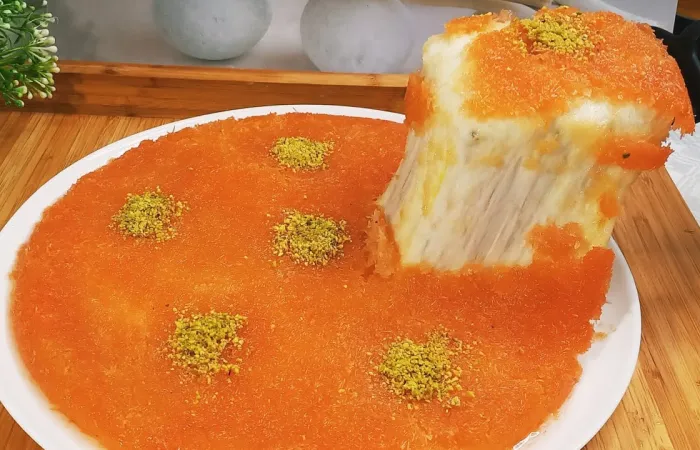 5. الخبز: تدخل الصينية إلى فرن متوسط الحرارة حتى تأخذ الكنافة لونًا ذهبيًا مائلًا للاحمرار.