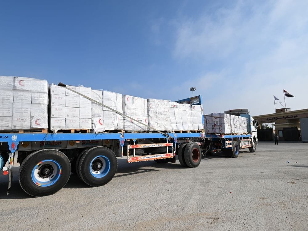 الغذائية والطبية وحليب الأطفال، و20 شاحنة محملة بأنابيب وخزانات ومعدات مخصصة لتشغيل خط المياه الجديد، المقرر أن يمتد من محطة تحلية المياه التي أقامتها الإمارات في مصر، وحتى منطقة النزوح الواقعة بين مدينتي رفح وخان يونس الفلسطينيتين بطول 7 كيلومترات وتنتج 2 مليون جالون يومياً، بحسب وكالة الأنباء الإماراتية (وام).